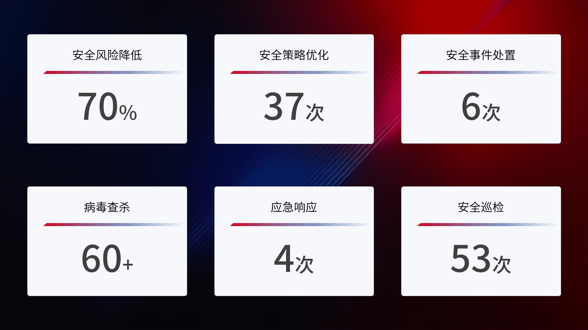 提供全面的安全事件报告体系,,,,包括处置报告、、、、周报、、季度和年度总结,,,,结合持续监控,,,帮助客户深入了解网络安全状况。。。