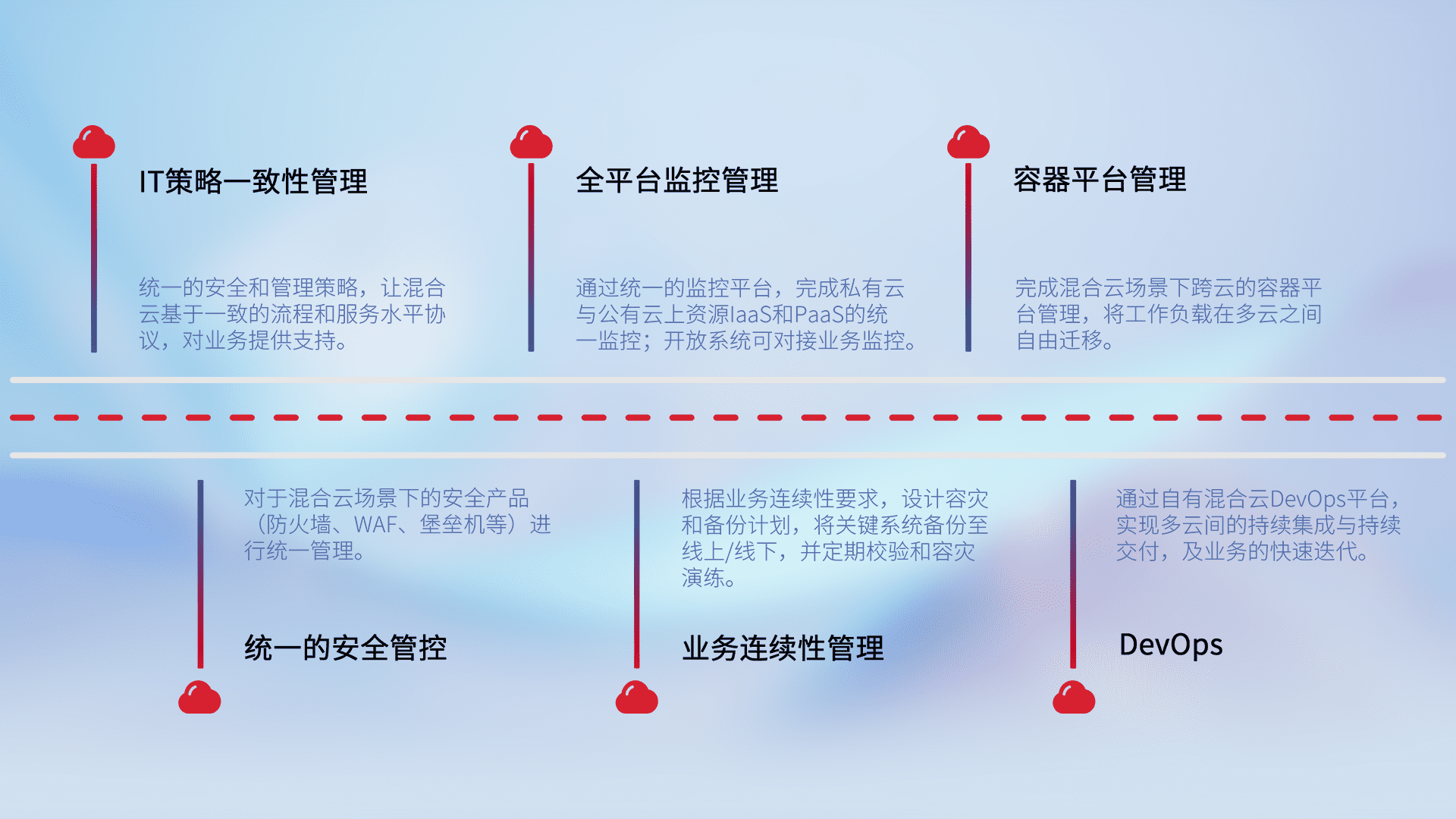 通过多云纳管,,以统一的资源数据模型把客户的云资源进行抽象和封装,,,,进而实现对多云资源的统一操作,,,保障云资源管理的可靠性、、、、稳定性与可用性。。量身定制化运维内容,,,配置、、、开发运维、、补丁管理、、、、备份、、、、监控、、、、认证和访问管理、、、审计和日常巡检等,,,,保障在用云过程中的可靠度,,,稳定度以及高可用率。。。。